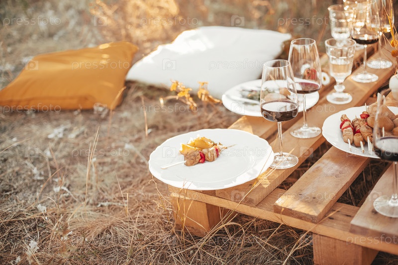 Деревянный стол со стеклянной посудой для пикника