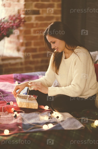 Женщина упаковывает рождественский подарок дома среди гирлянд