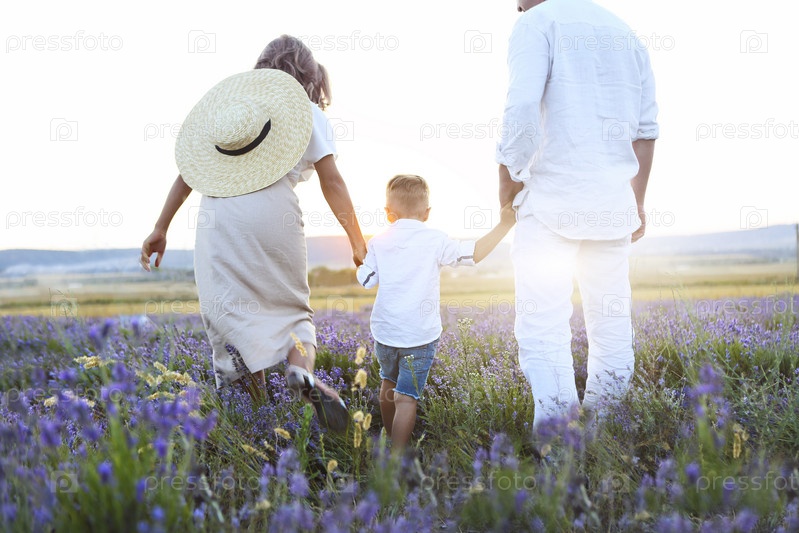Мать, отец и их маленький сын гуляют по сиреневому полю