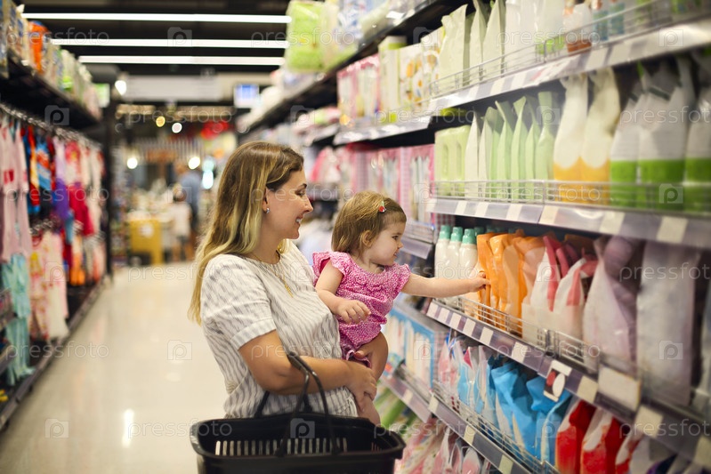 Веселая мать и ребенок проводят время за покупками в торговом центре