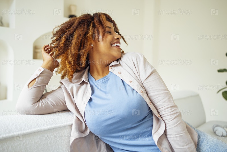 Афро-американская тысячелетняя девушка, довольная и счастливая, сидит на удобном диване в уютной современной светлой гостиной