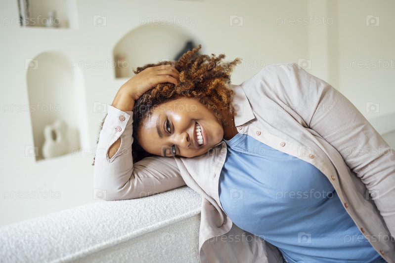 Афро-американская тысячелетняя девушка, довольная и счастливая, сидит на удобном диване в уютной современной светлой гостиной