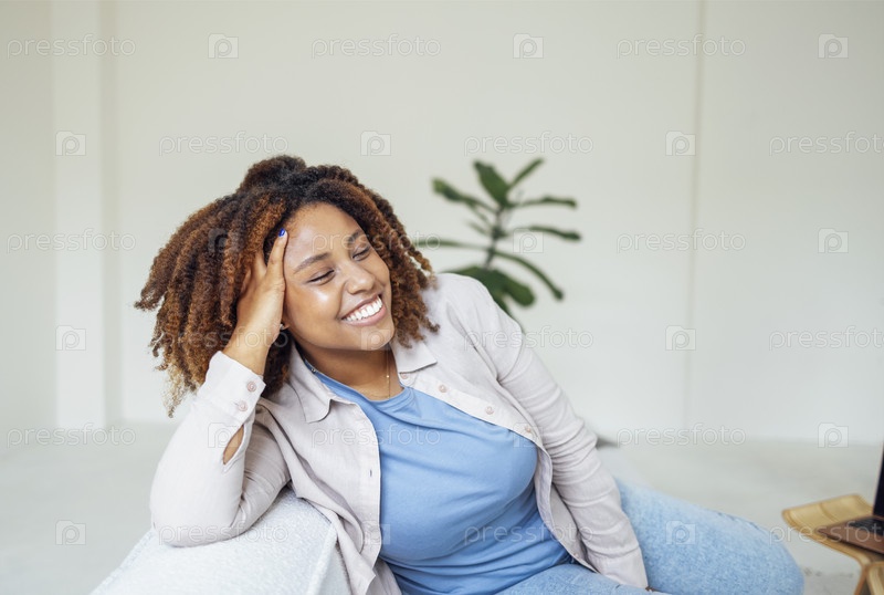Афро-американская тысячелетняя девушка, довольная и счастливая, сидит на удобном диване в уютной современной светлой гостиной