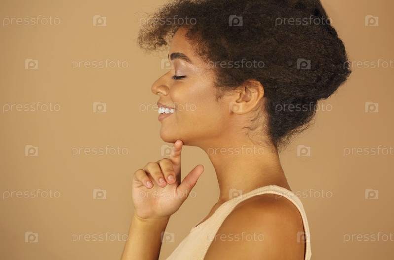 Крупный план портрета молодой девушки смешанной расы, смотрящей в сторону с улыбкой