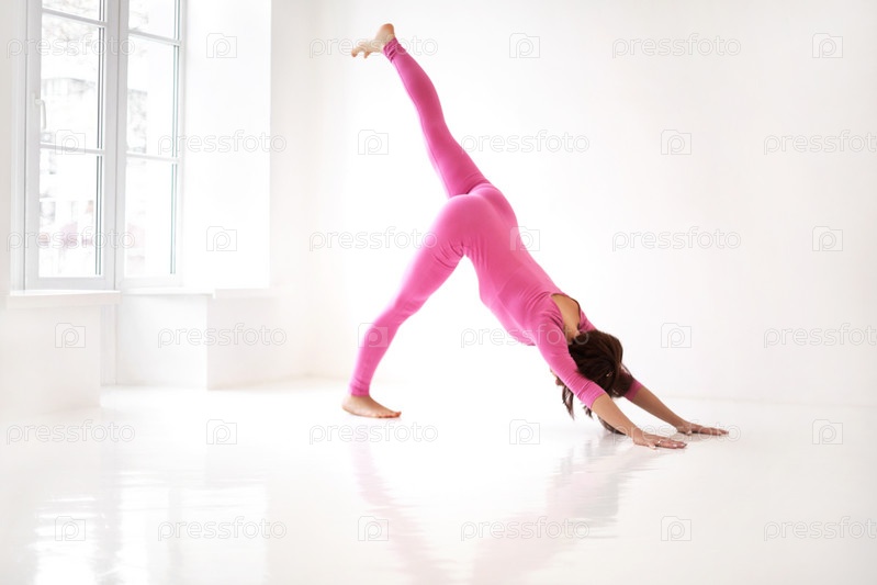 Стройная женщина делает балансирующую асану стойки на руках