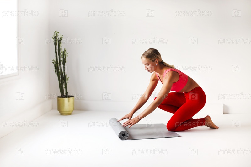 Женщина в спортивной одежде готовит коврик для урока йоги