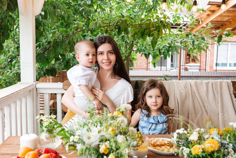 Веселая мать с маленькими детьми на террасе