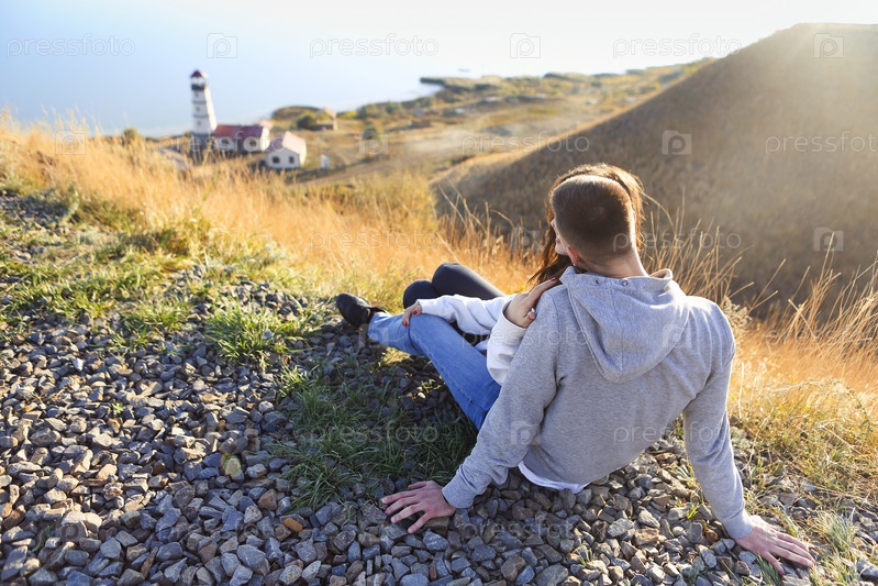 Романтическая пара, одетая в уютные свитера вместе возле маяка