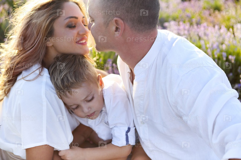 Мать, отец и их маленький сын гуляют по сиреневому полю