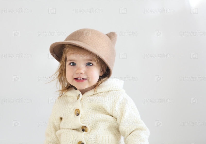 Симпатичная улыбающаяся малышка, смотрящая в сторону, изолированная на белом