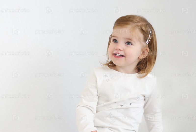 Симпатичная девочка-малыш, смотрящая в сторону, изолированная на белом