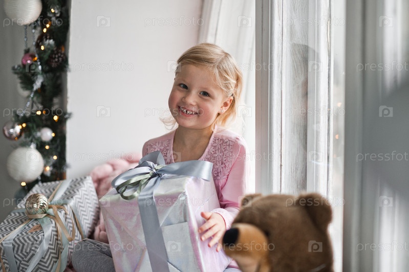 Маленькая девочка в розовом платье с огромным рождественским подарком