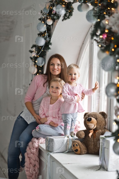 Мать с двумя маленькими дочерьми сидит на подоконнике Раунд, декор