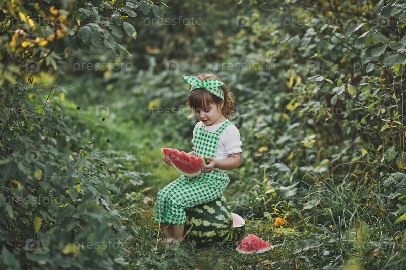 Маленькая девочка выбирает семечки из арбуза