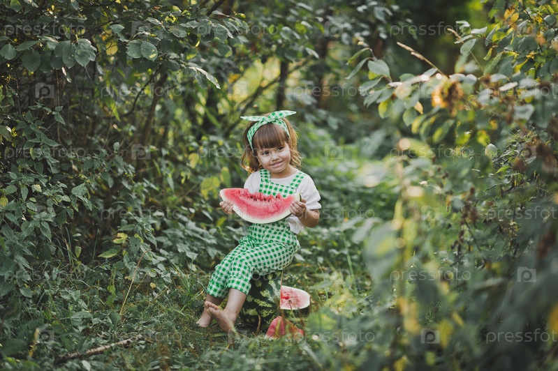 Счастливый ребенок на прогулке ест арбуз