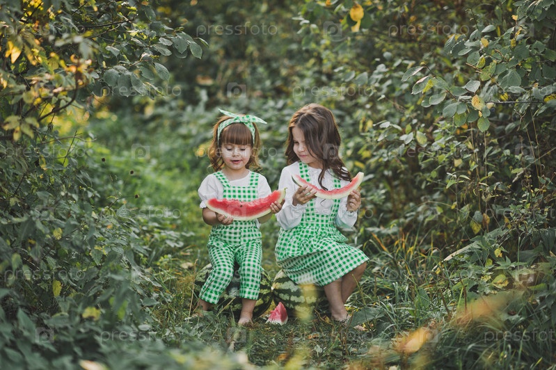 Две сестры на природе едят арбуз
