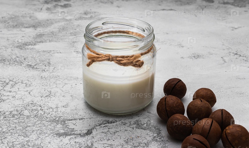Концепция Всемирного дня вегана. Ореховое молоко в стеклянной банке с макадамией. Домашний альтернативный молочный продукт. На растительной основе, без лактозы. Выборочный фокус