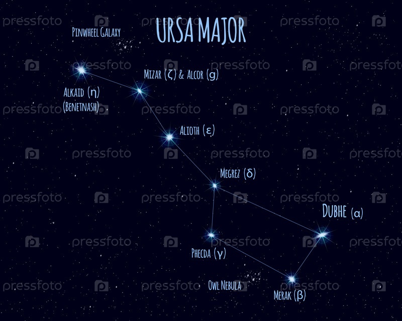 Созвездие Большой Медведицы (Большой Медведицы, Большой Медведицы), иллюстрация с названиями основных звезд на фоне звездного неба