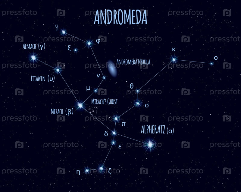 Созвездие Андромеды, иллюстрация с названиями основных звезд на фоне звездного неба