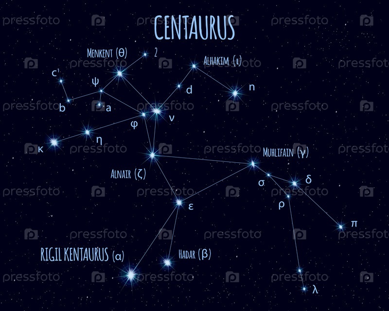 Созвездие Центавра (Кентавра), иллюстрация с названиями основных звезд на фоне звездного неба
