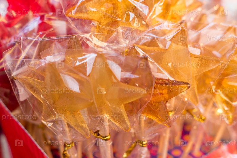 Крупный план красочных леденцов на палочке в форме звезды в магазине