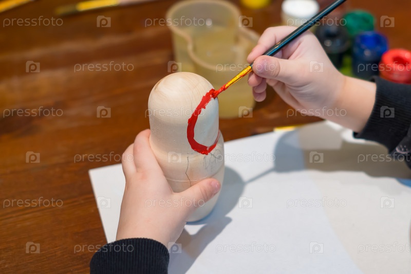 Маленький мальчик красит русскую матрешку матрешку красной краской