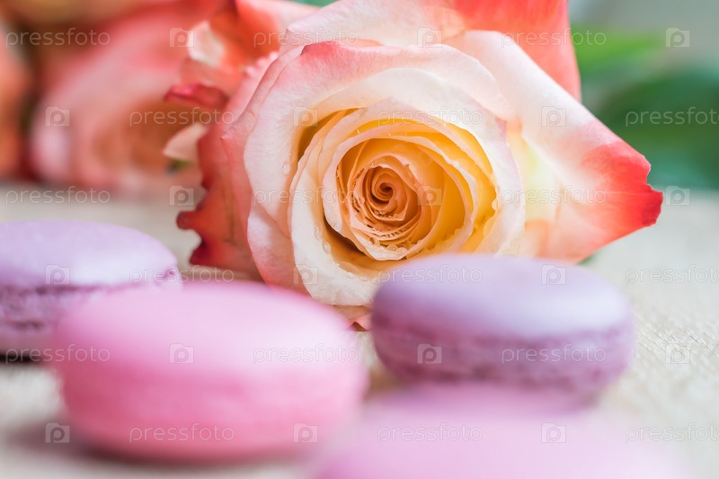 Нежные французские десертные миндальные печенья с цветком розы на деревянном фоне