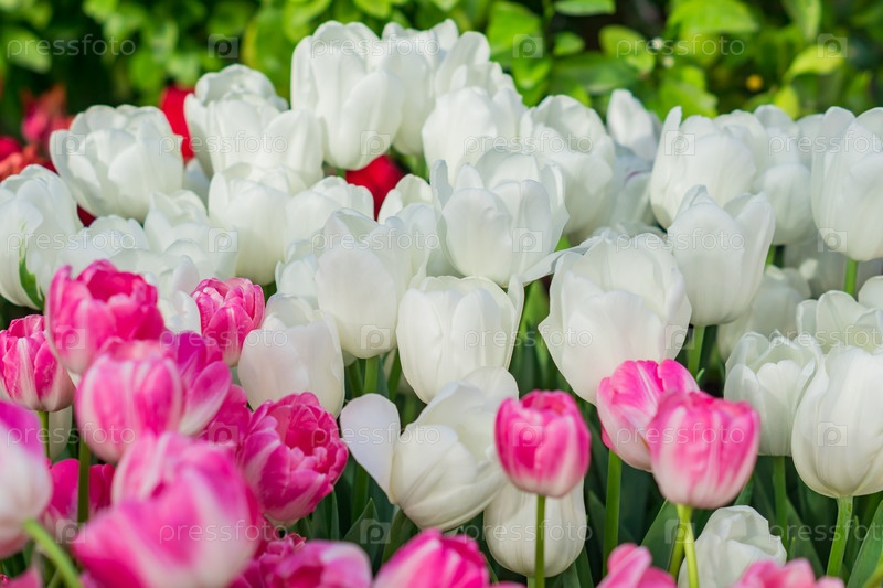 Поле белых и розовых тюльпанов. Цветочный весенний фон