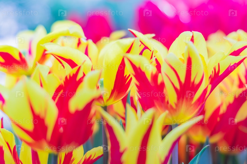 Желтые и красные тюльпаны крупным планом, цветочный фон
