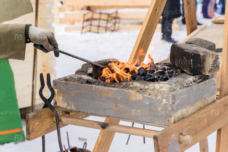 Кузнец вручную кует расплавленный металл на наковальне под открытым небом