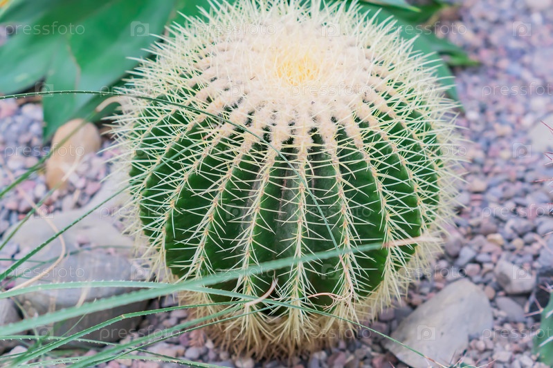 Крупный план круглого кактуса в форме шара в ботаническом саду
