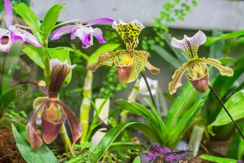 Цветущая орхидея Paphiopedilum в ботаническом саду