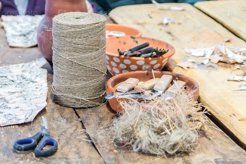 Принадлежности для рукоделия на деревянной табе