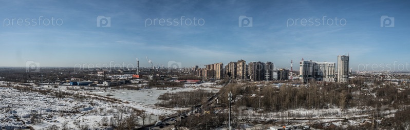 Панорамный вид на жилой комплекс на окраине города под голубым небом