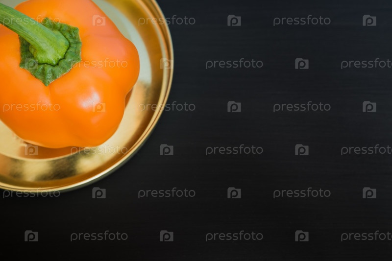 Оранжевый сладкий перец на черном фоне, вид сверху, место для копирования текста