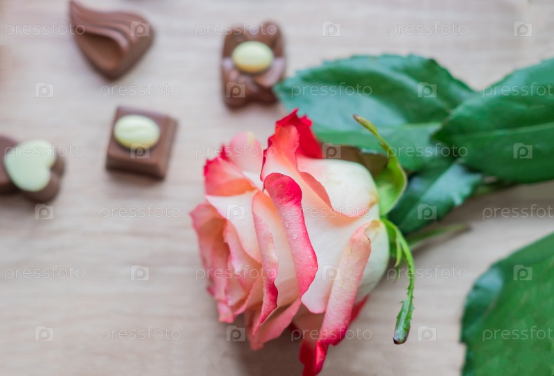 Шоколадные конфеты в форме сердца и розовая роза на деревянном столе