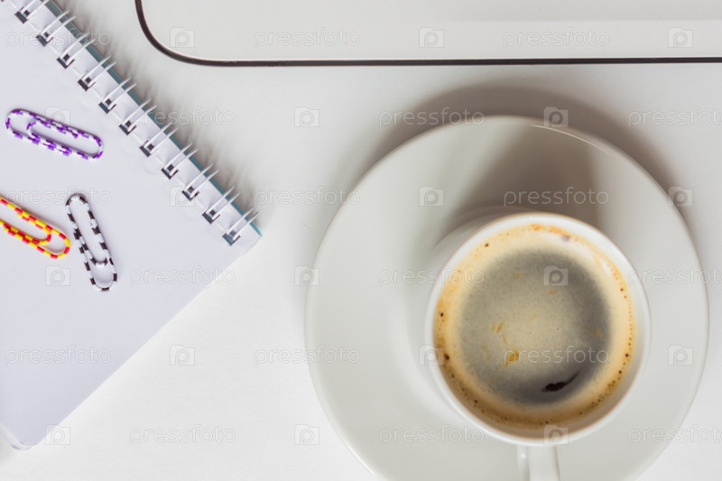 Вид сверху на офисный стол - блокнот, бумага для заметок, чашка кофе