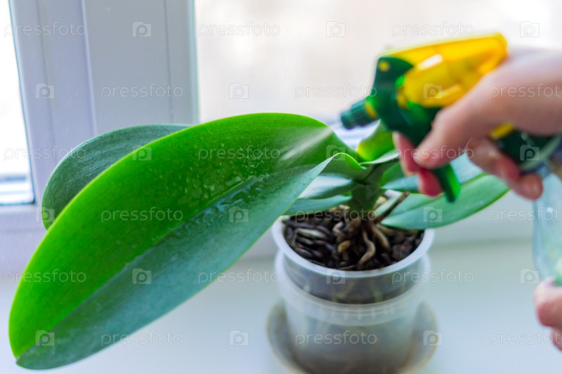 Женская рука распыляет зеленые листья моховой орхидеи в горшке, стоящем на подоконнике. Концепция ухода за комнатными растениями