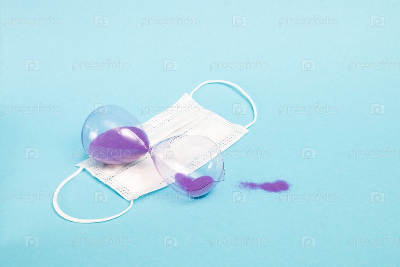 Сломанные песочные часы с фиолетовым песком и медицинская защитная белая маска на синем фоне копируют пространство, концепция смертельной болезни