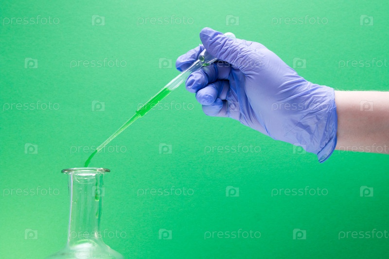 Женская рука в синей одноразовой перчатке держит большую пластиковую пипетку, капает зеленую жидкость в колбу, зеленый фон, пространство для копирования