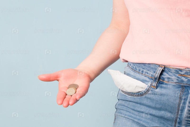 Женщина держит в ладони рублевые монеты, концепция финансовых проблем, кризис и газовые деньги, концепция безработицы, синий фон, пространство для копирования