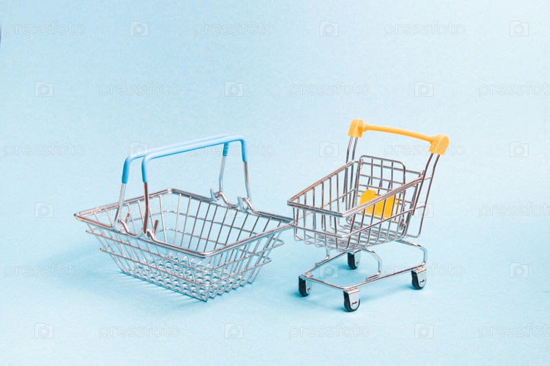 Маленькая корзина для игрушек и тележка для покупок на синем фоне, пространство для копирования, концепция покупок