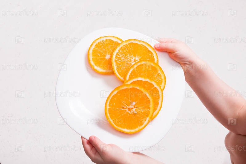 Маленький ребенок держит белую тарелку с дольками апельсина на белом фоне
