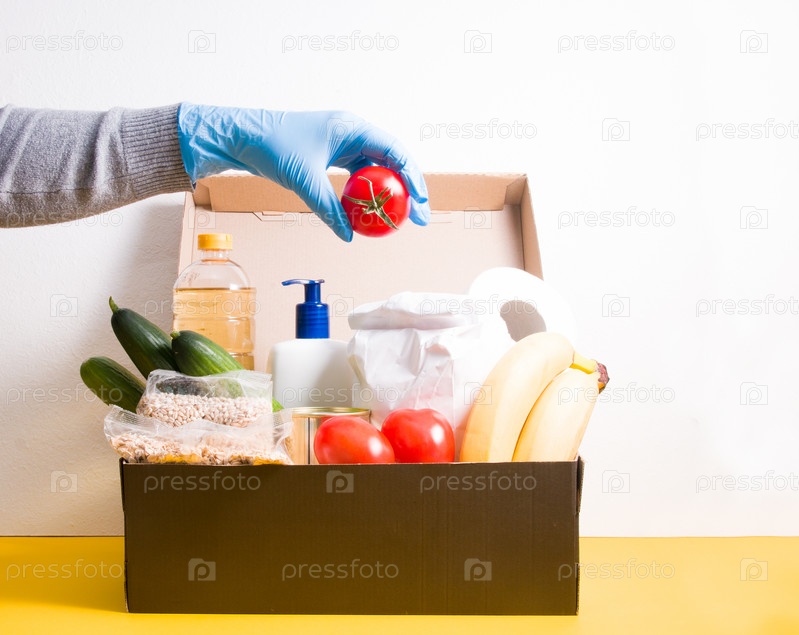 Женская рука кладет помидор в коробку с продуктами, продуктами и средствами гигиены для пожертвований, пространство для копирования, белый и желтый фон