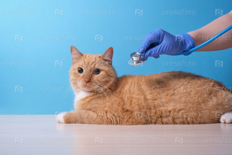 Ветеринар слушает сердце и легкие кошки стетоскопом, кошка лежит на столе, синий фон, пространство для копирования, концепция ветеринарной медицины