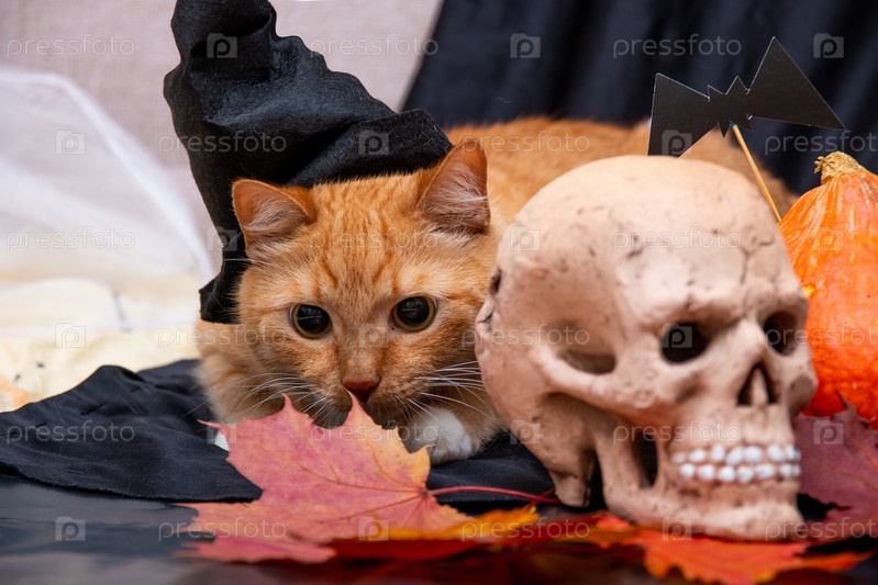Рыжий кот в черной шляпе и череп на осенних листьях на черном фоне