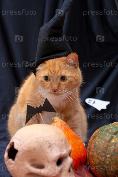 Рыжий кот в черной шляпе с хэллоуинскими тыквами и черепом на темном фоне вид спереди призрак на фоне белый черный