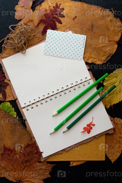 Сухие осенние листья и зеленые цветные карандаши на чистом листе блокнота, веревка, наклейка, изюм, праздничный подарок, запись в блокноте, черный фон, вид сверху, место, копия, сухие осенние листья