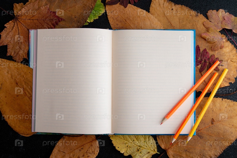 Сухие осенние листья и желто-оранжевый цветной карандаш на чистом листе блокнота, веревочная наклейка, изюм, праздничный подарок, запись в блокноте, черный фон, вид сверху, место, копия, сухие осенние листья