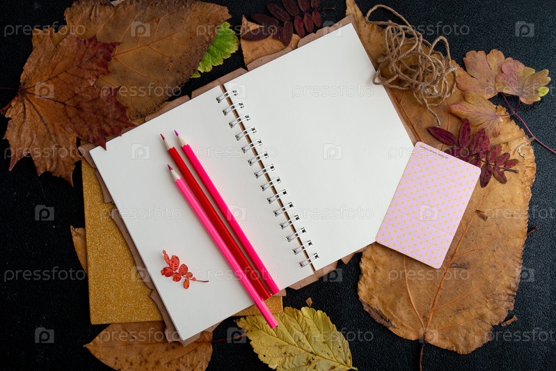 Сухие осенние листья и розовые цветные карандаши на чистом листе блокнота, веревка, наклейка, изюм, список праздничных подарков, запись в блокноте, черный фон, вид сверху, место, копия, сухие осенние листья